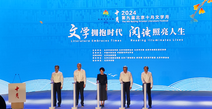 十月文学月开幕式,全国人大常委会副委员长、中国作协主席铁凝,全国政协副主席、民进中央常务副主席朱永新出席。“人民艺术家”王蒙,中国作协党组成员、副主席、书记处书记吴义勤,北京市委副书记刘伟出席并致辞。